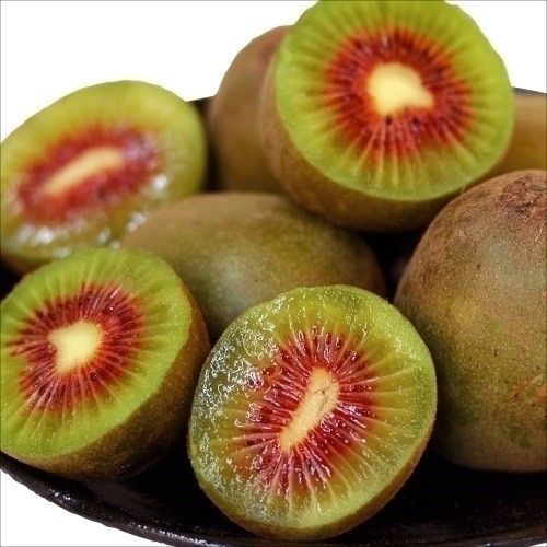 果肉の中心部が鮮やかな紅色に染まる、非常に珍しいレインボータイプのキウイです。一般的なキウイに比べて一回り小さく、表面に毛がほとんどないツルツルとした皮が特徴。