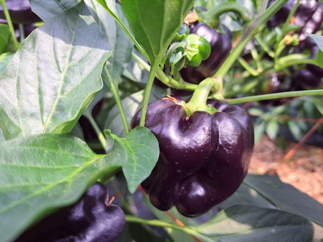 「浜クロピー」は、その名の通り、光沢のある深い紫黒色の肌が特徴的なピーマンです。横浜の種苗会社によって育成された品種で、一般的な緑色のピーマンとは一線を画すビジュアルから、直売所やこだわり野菜のコーナーで注目を集めています。 この黒い色の正体は、ブルーベリーなどにも含まれる抗酸化成分「アントシアニン」。実はこの黒色は、完熟前の若い状態で、さらに熟させると鮮やかな赤色に変化するという、色の移り変わりも楽しめる非常にユニークな野菜です。